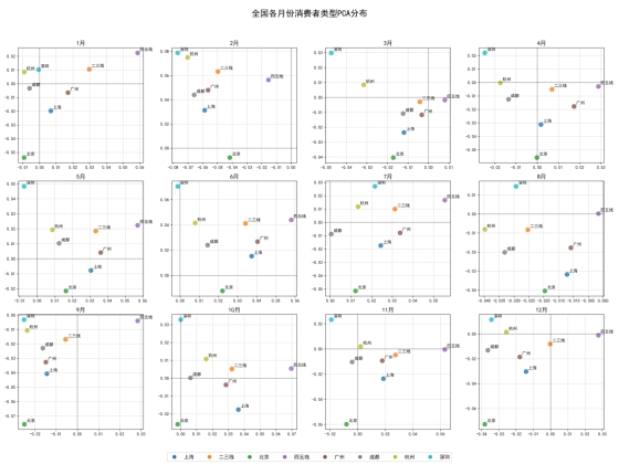 在消费品类的选择上,高线城市的影响力似乎也在减弱。我们使用PCA降维分析了不同人群的月度消费品类分布。结果显示(如图4),在四五线城市,从一线城市迁入的人群与本地常住人群的消费品类习惯并未随着时间推移而变得更加接近。这表明,在品类偏好上,一线城市的模板作用正在弱化。