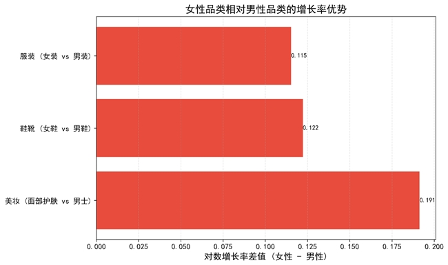 报告首先确认了性别产品增长差异的普遍性。对比服饰内衣、鞋靴、美妆护肤三大核心类目下的六个代表性二级品类(女装/男装、时尚女鞋/流行男鞋、面部护肤/男士面部护肤),数据显示(如图8),女性相关品类的销售额对数增长率(2025年初 vs 2024年同期)显著高于男性对应品类。