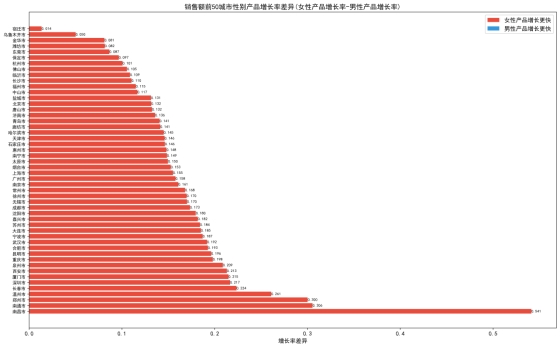 进一步分析销售额前50的城市数据(如图9),发现这种女性产品增长更快的现象几乎在所有主要城市都存在,平均增长率差异达到0.152左右,证实了其全国普遍性。