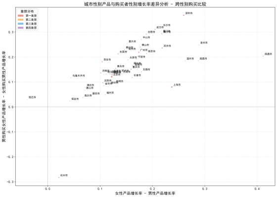 这种消费重心的转移呈现出显著的性别不对称性,构成了跨性别礼赠行为的核心特征。分析显示,男性购买女性产品的增长动力普遍强于女性购买男性产品的增长动力。将性别产品增长差异与跨性别购买增长差异结合分析(如图10),可以清晰看到,绝大多数城市呈现出女性产品增长更快且男性为女性购买的增速更快的格局。